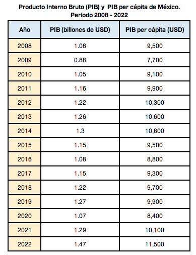 Según datos del Banco Mundial, en 2022, el PIB de México a precios actuales fue de aproximadamente 1.47 billones de dólares estadounidenses.