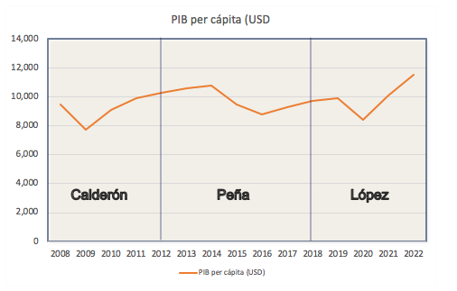 El PIB per cápita refleja un nivel de vida relativamente bajo en comparación con países avanzados, aunque este sea mucho más alto que otros países de América Latina y África. Indicando que si bien ha logrado que la producción económica promedio por habitante sea moderada, también sugiere que hay una fuerte desigualdad en la distribución de la riqueza dentro del país. En resumen, México está en una posición intermedia.